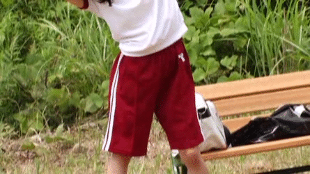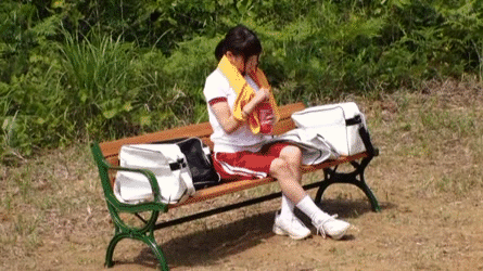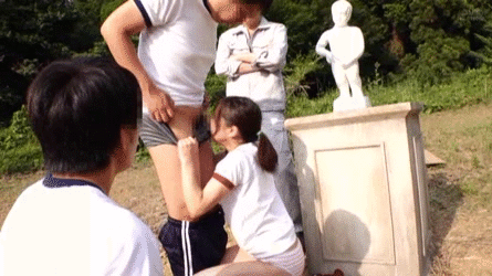 この展開は珍しい!媚薬を飲まされ欲情してしまう女の子…飲ませたおっさんがやるのではなく同級生の男の子のチンポを求めてしまう!?慌ててズボンを脱がせ食らいつくようにチンポをしゃぶるジャージ女子高生の3P青姦GIF画像です。